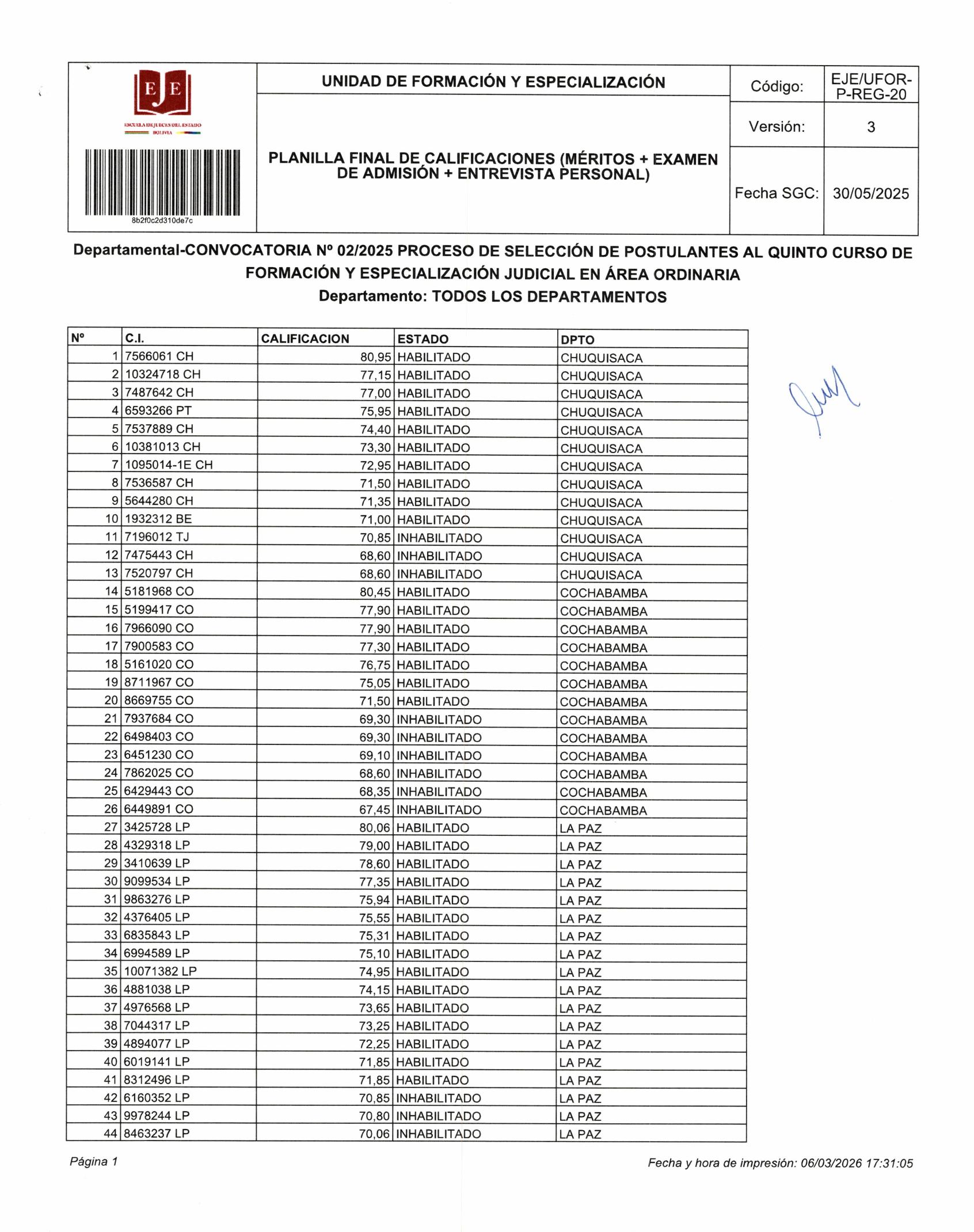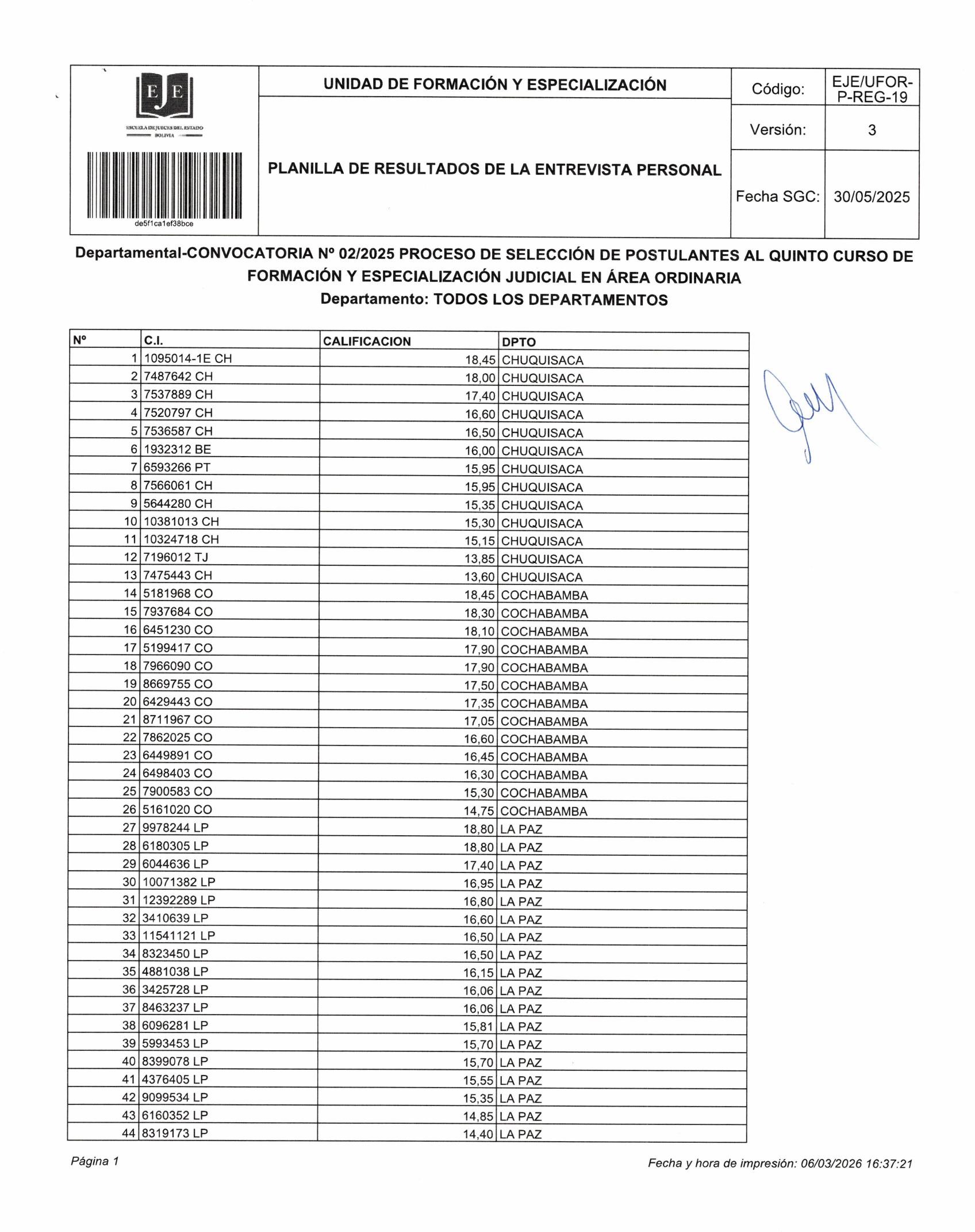 PLANILLA DE RESULTADO DE LA FASE DE ENTREVISTA PERSONAL – QUINTO CURSO DE FORMACION Y ESPECIALIZACION JUDICIAL EN AREA ORDINARIA CONVOCATORIA 02/2025