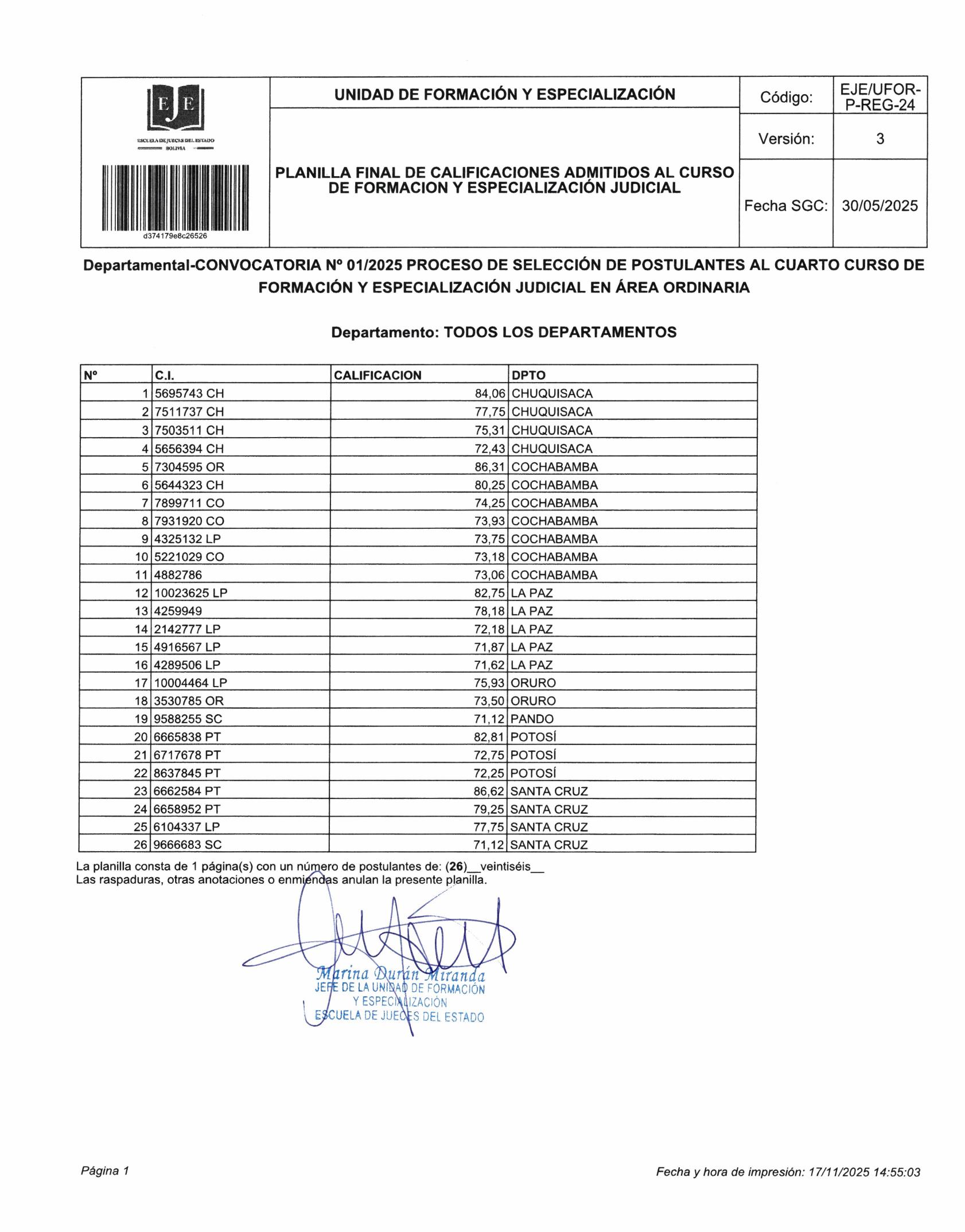 La Escuela de Jueces del Estado, comunica que, en cumplimiento del artículo 41 del Reglamento Específico de la Unidad de Formación y Especialización y en virtud a la Resolución Administrativa de la Dirección General No. 55/2025 de fecha 18 de noviembre de 2025 que instruye la publicación inmediata de resultados de la Fase de Evaluación Psicológica para el Cuarto Curso de Formación y Especialización Judicial en Área Ordinaria, publica la planilla final y definitiva de admitidas y admitidos al Cuarto Curso de Formación y Especialización Judicial en Área Ordinaria, a través del sitio web oficial de la Escuela de Jueces del Estado.