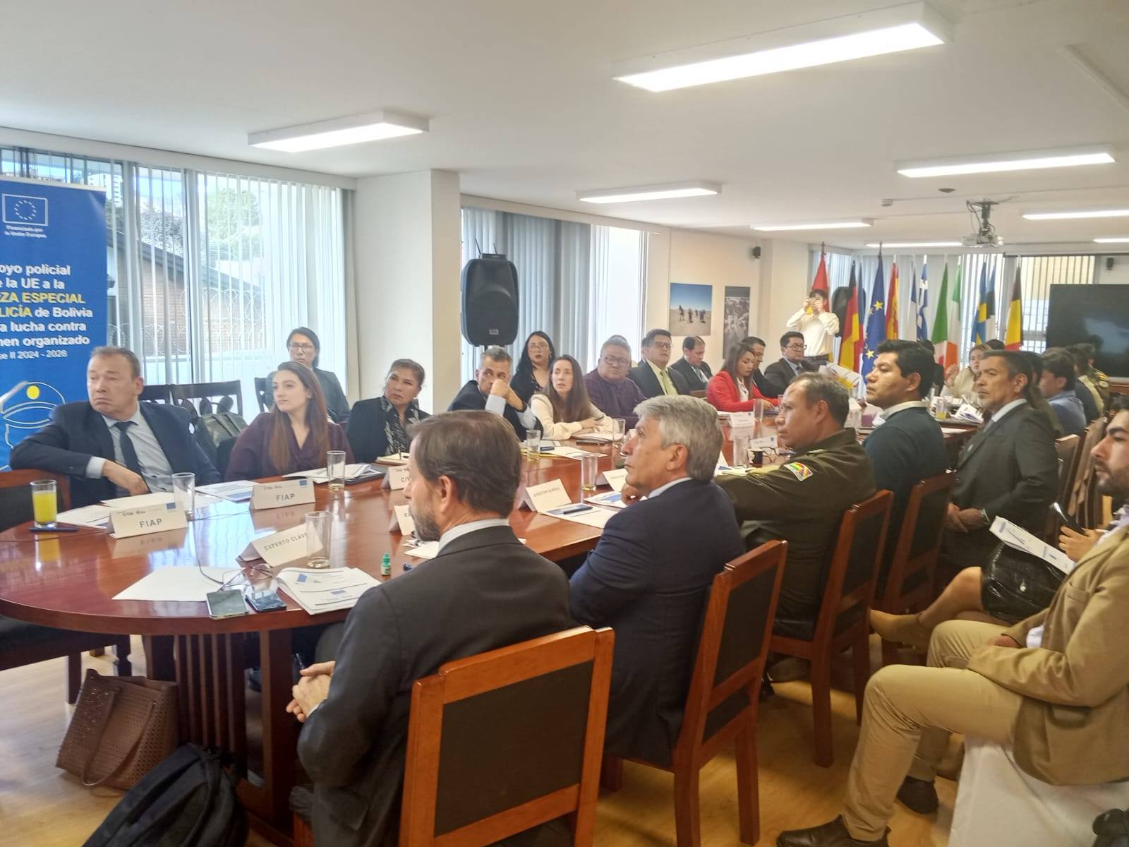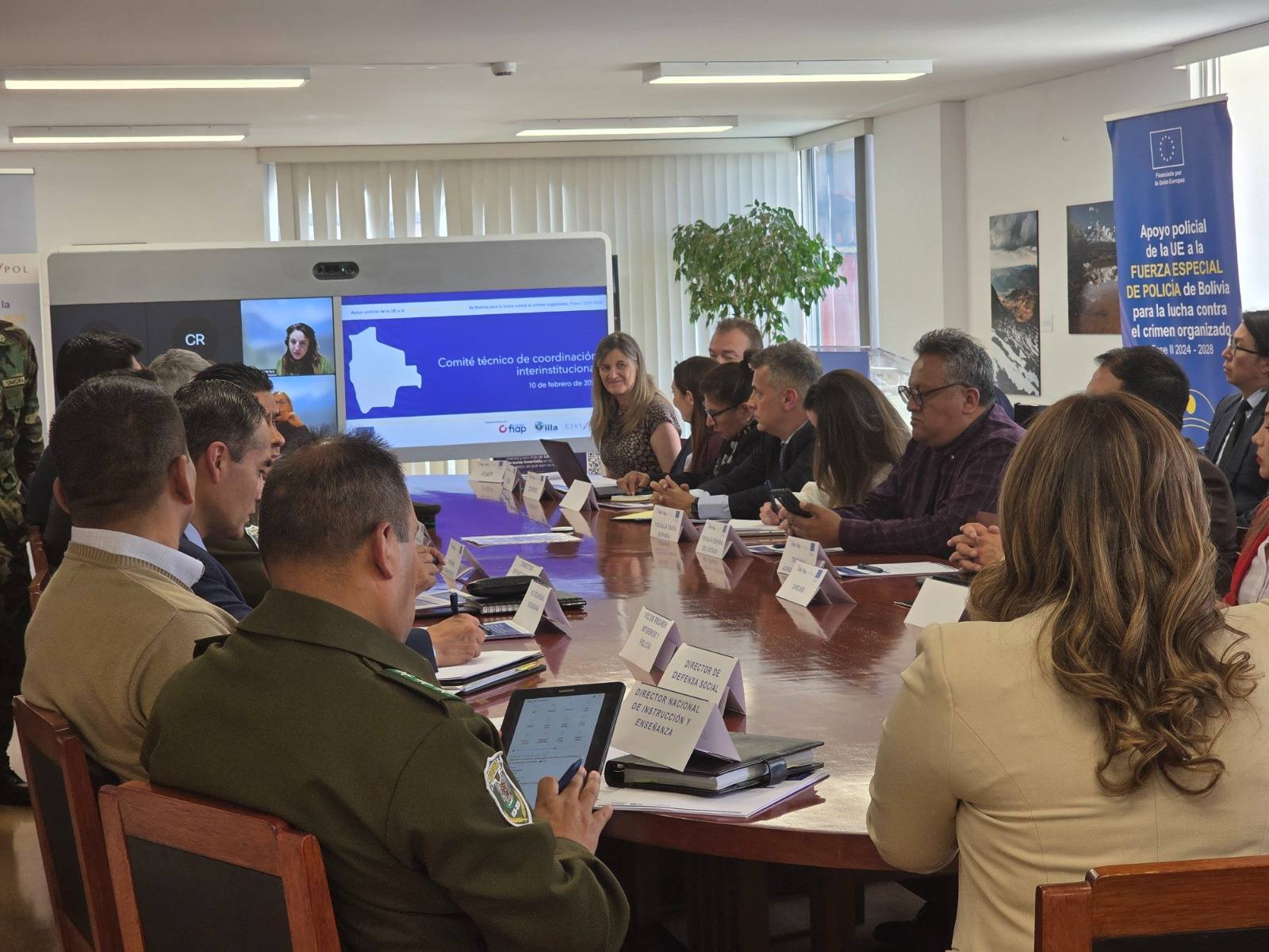 En representación de la Escuela de Jueces del Estado(EJE), la Dra. Marina Durán Miranda, Directora de la EJE, junto al Asesor Legal de la institución, Dr. Iván Carballo Medina, participaron en la II Reunión Ordinaria del Comité Técnico de Coordinación Interinstitucional del proyecto “Apoyo policial de la Unión Europea a la Fuerza Especial de Policía de Bolivia para la lucha contra el crimen organizado. Fase II 2024 – 2028”, financiado por la Unión Europea e implementado por la Fundación para la Internacionalización de las Administraciones Públicas (FIAP), la Organización Internacional Ítalo-Latinoamericana (IILA) y CIVIPOL.