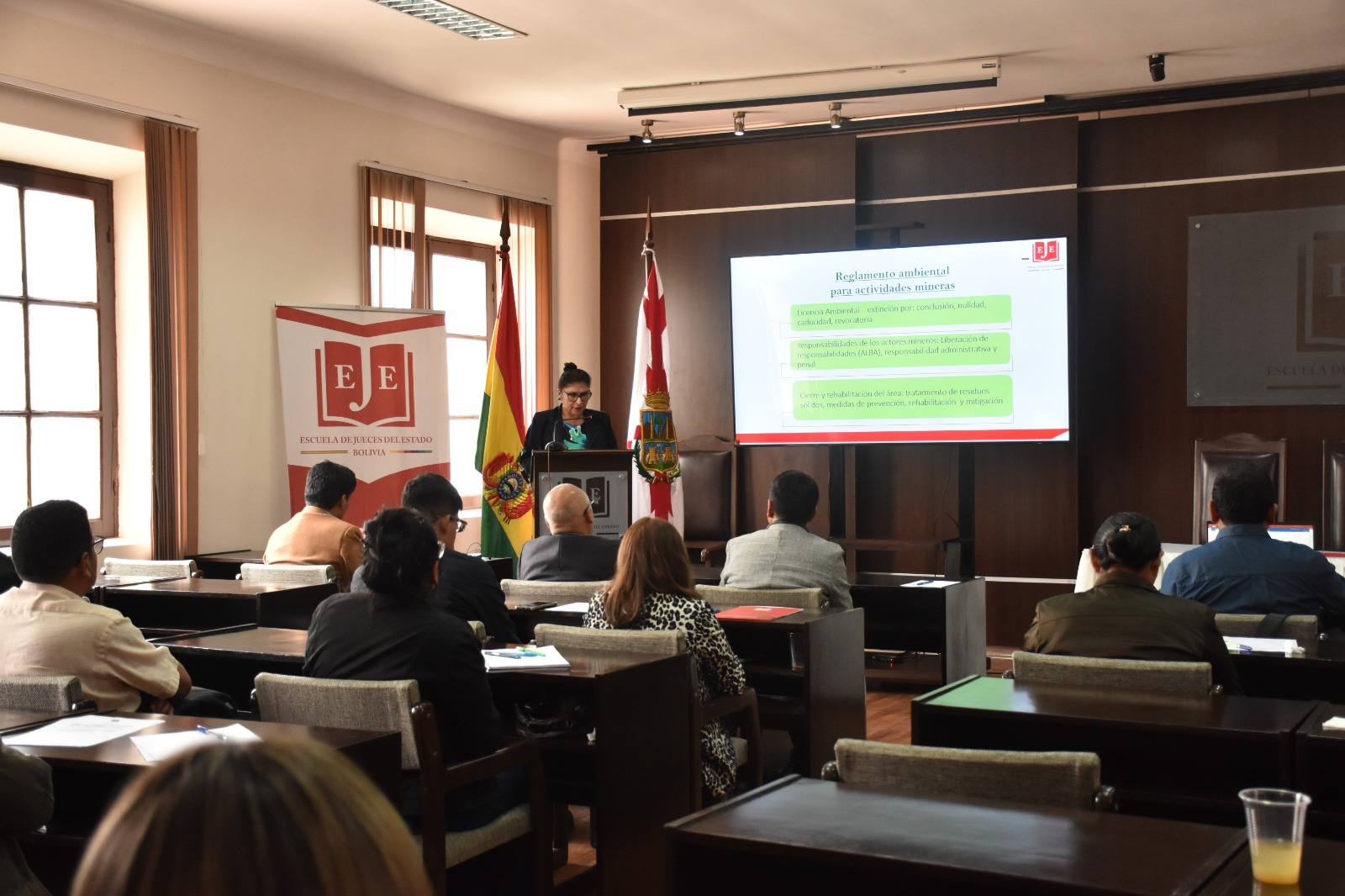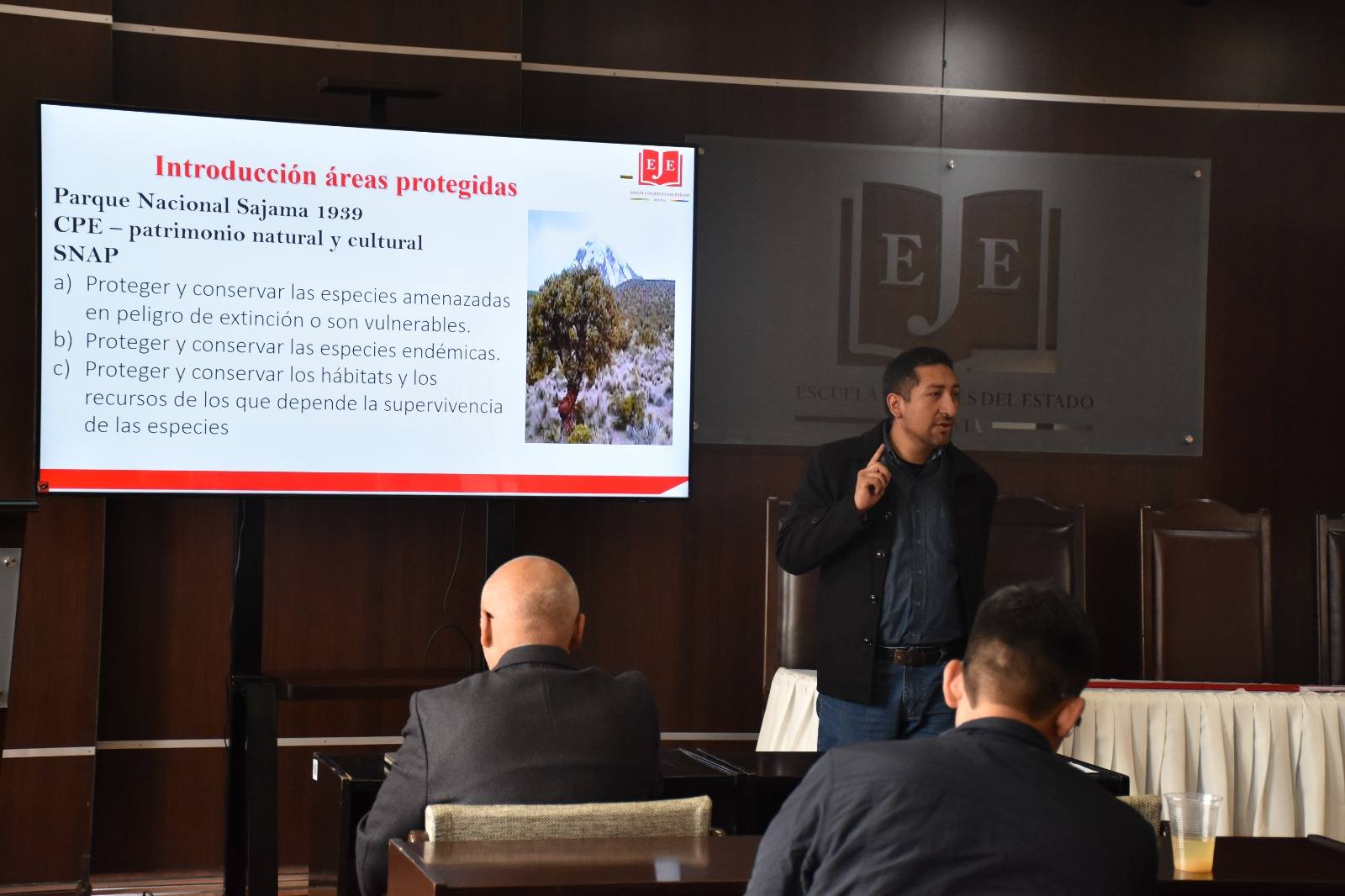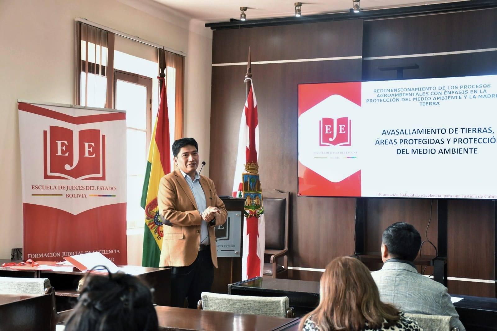 Durante la jornada final se desarrollaron las exposiciones sobre desalojo por avasallamiento en áreas protegidas, a cargo del Dr. Marbel Demetrio Mark Ponce, y contaminación minera ilegal en áreas protegidas, por el Dr. Fernando Reyes Torrez, Juez Agroambiental de Oruro.