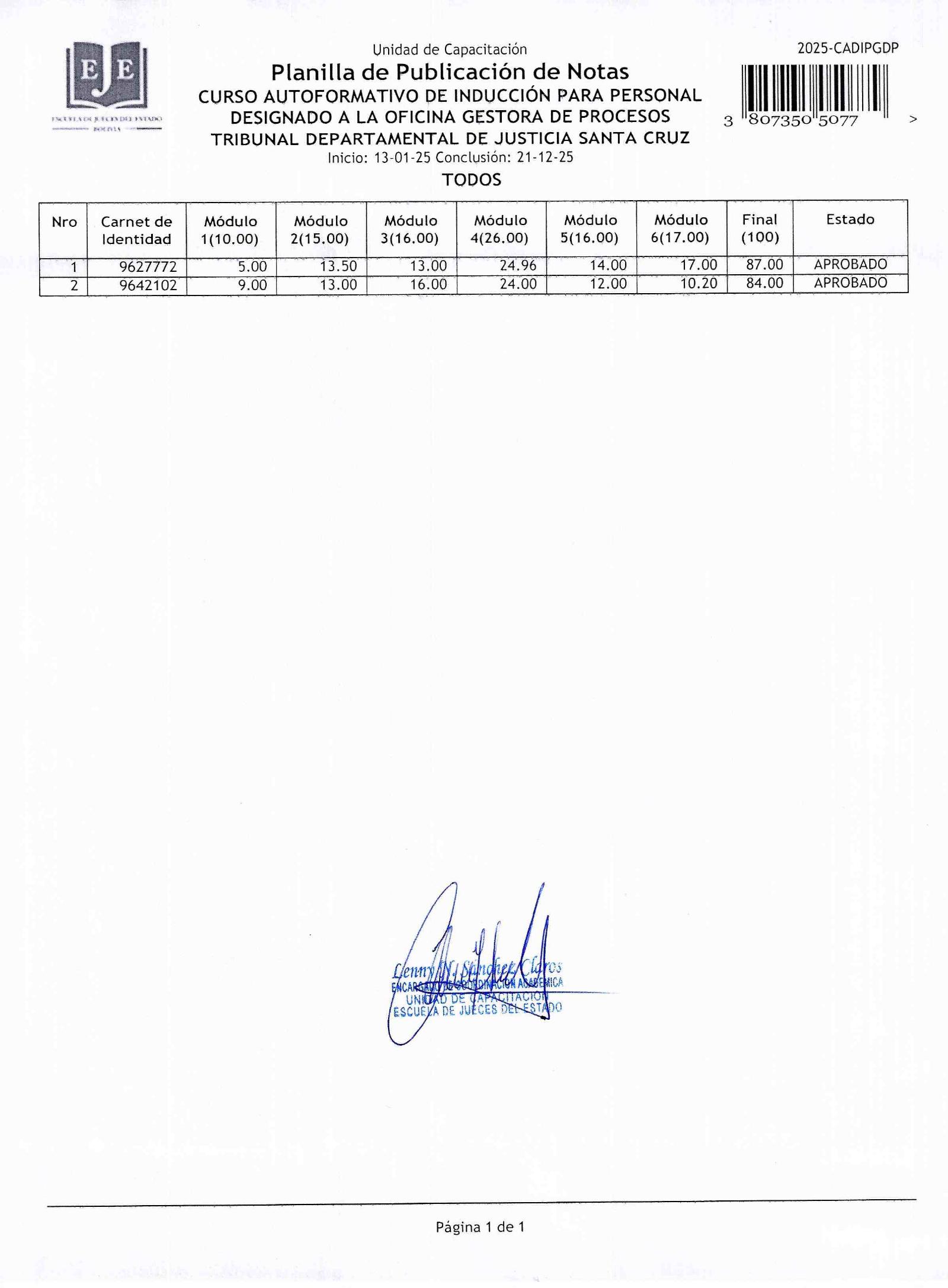 En estricto cumplimiento de las disposiciones académicas, establecidas en los artículos 41 y 42 del Reglamento Específico de la Unidad de Capacitación, se publica la planilla de calificación de la actividad denominada: