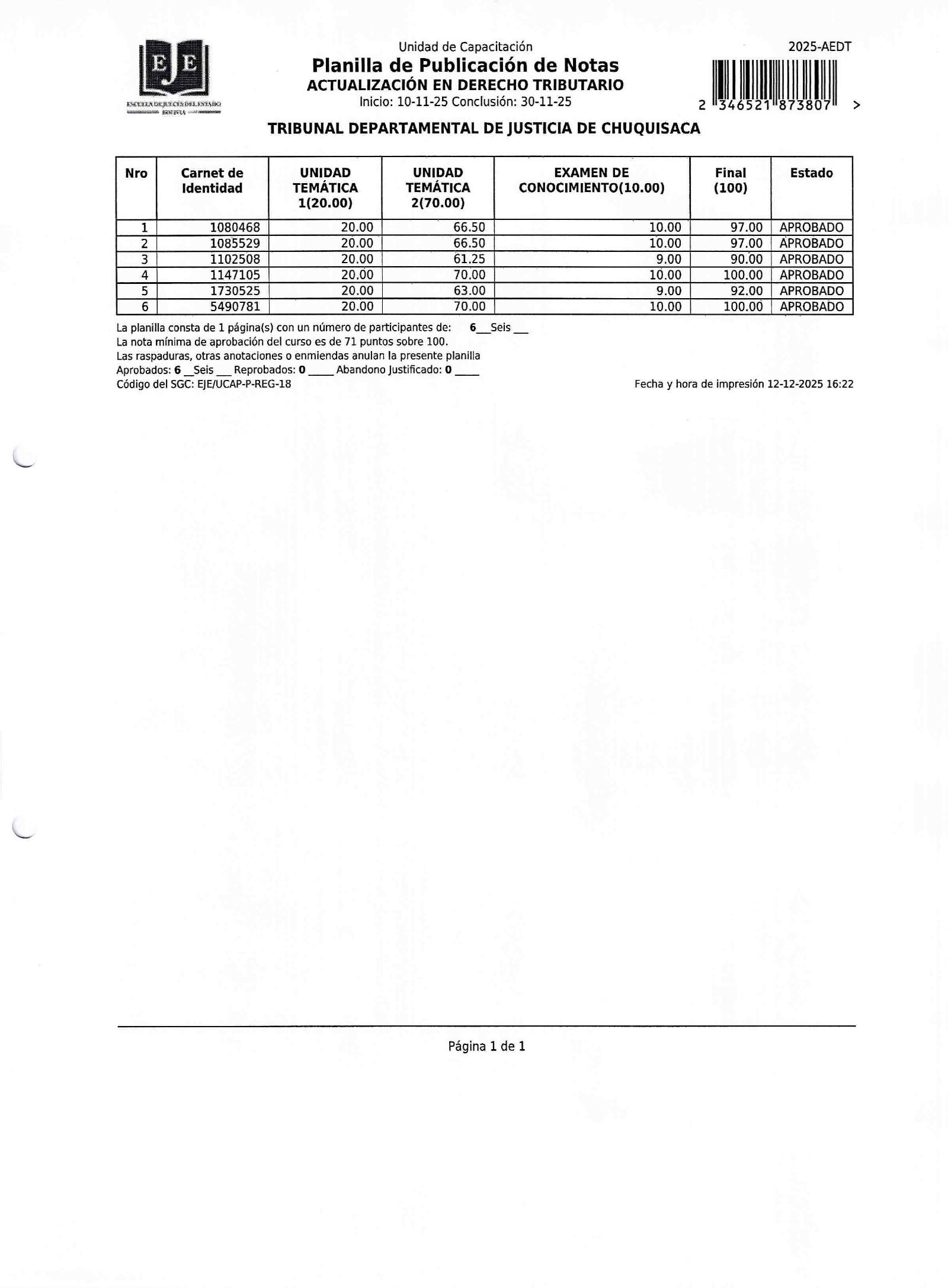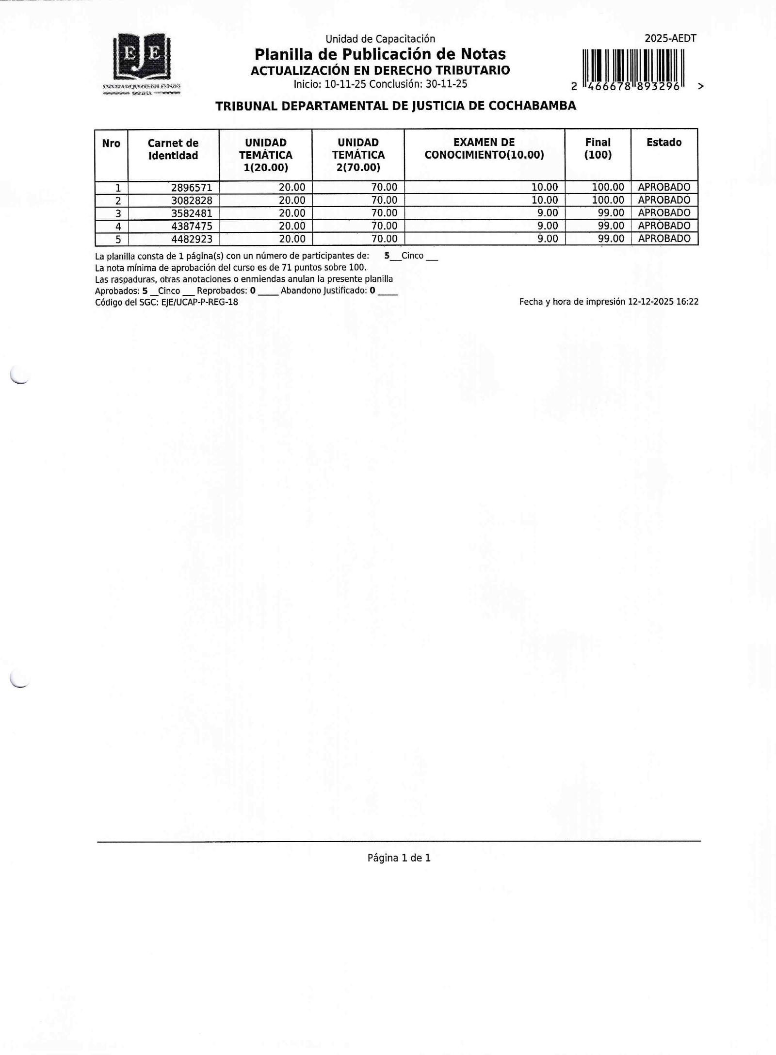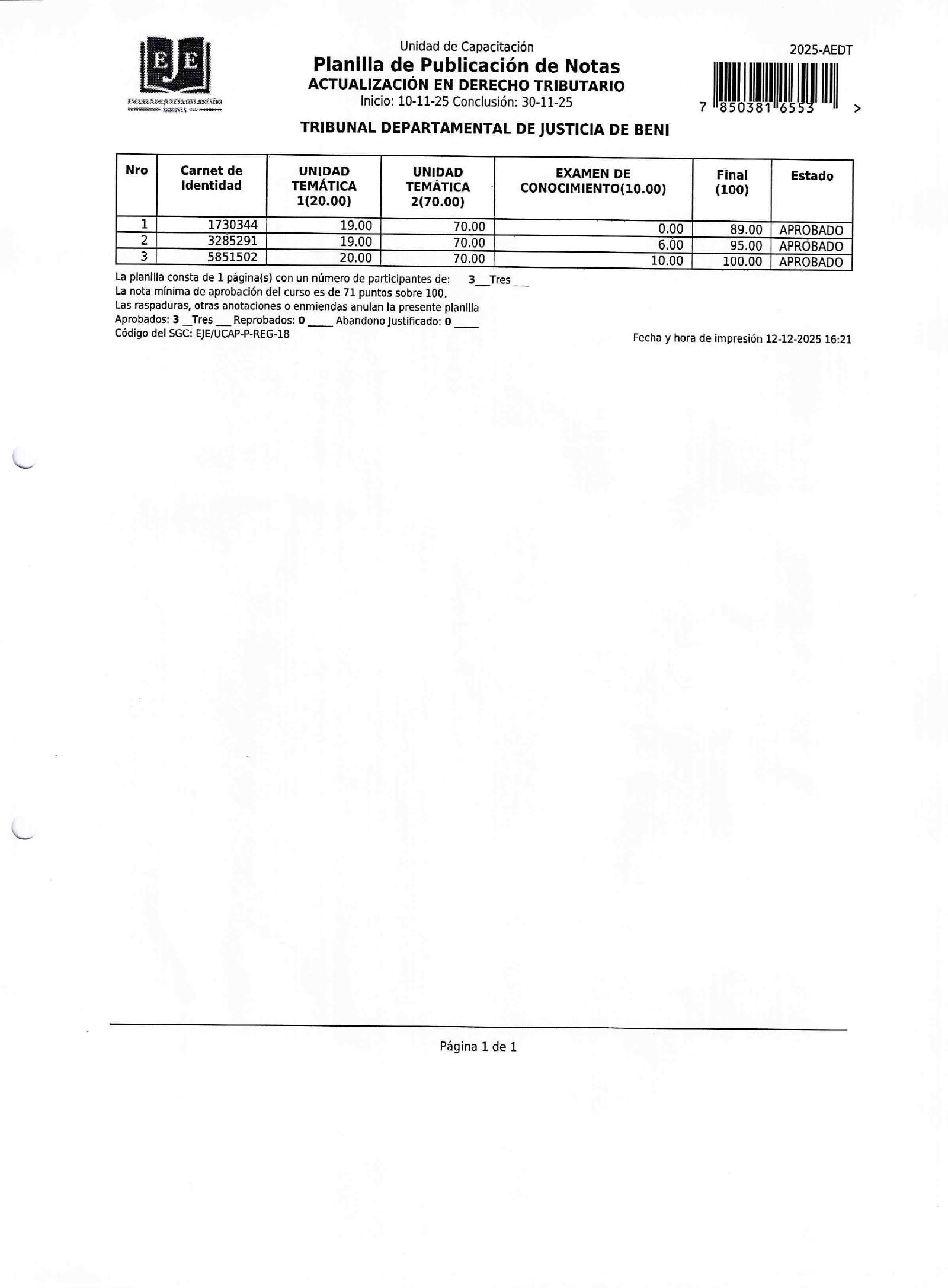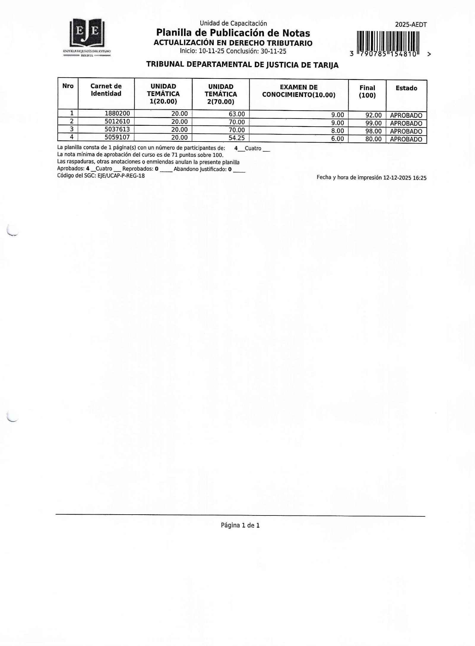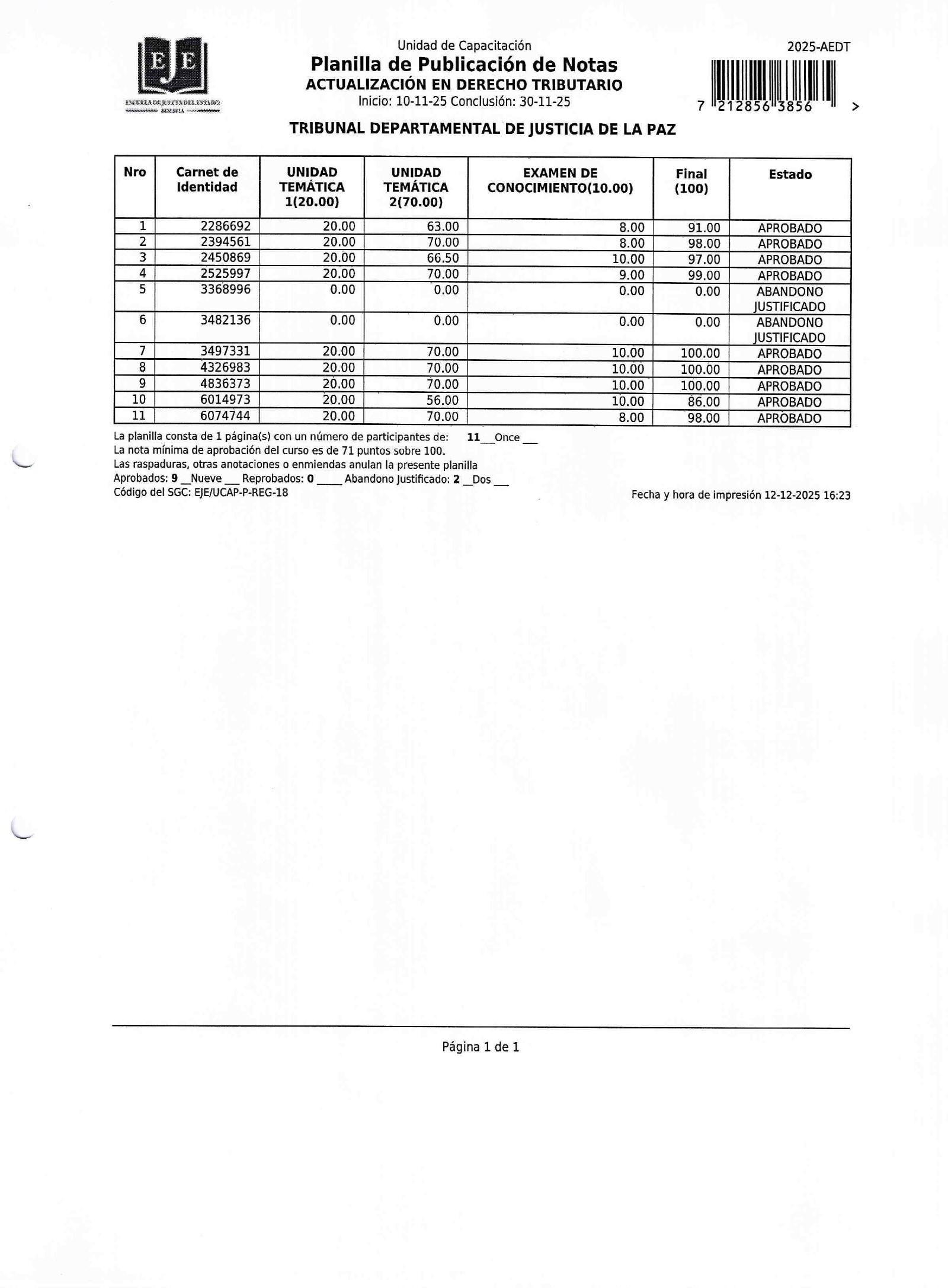 En estricto cumplimiento de las disposiciones académicas, establecidas en los artículos 41 y 42 del Reglamento Específico de la Unidad de Capacitación, se publica la planilla de calificación de la actividad denominada: