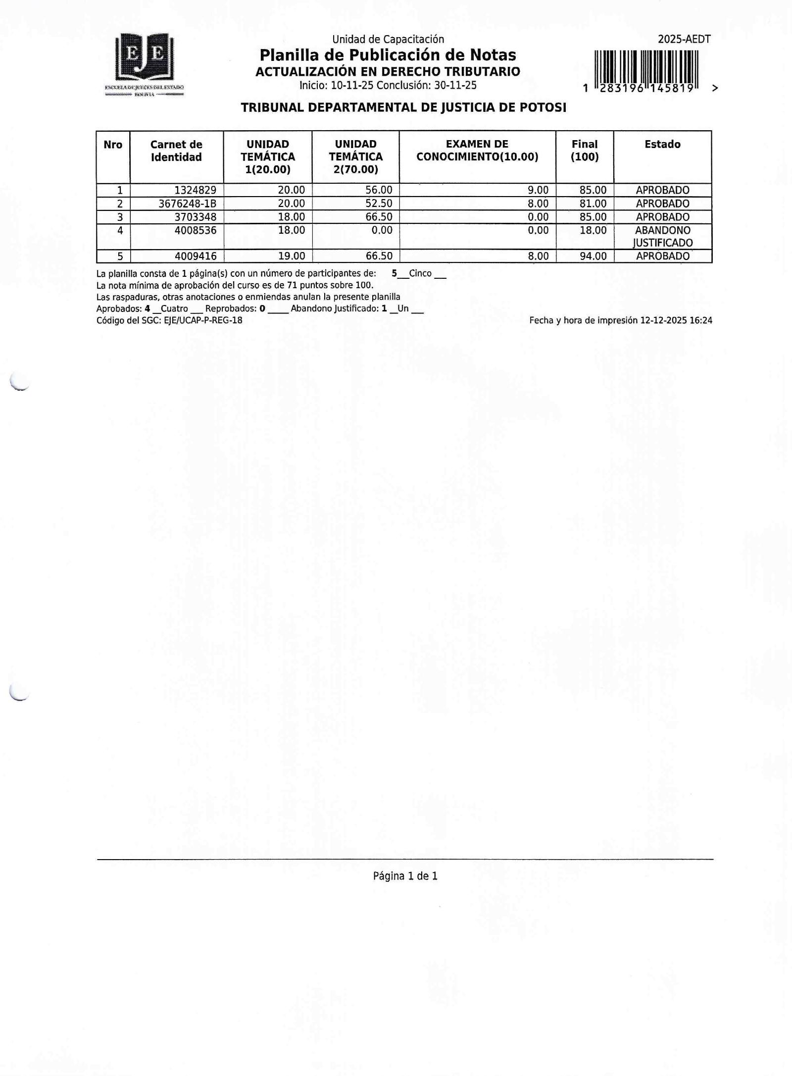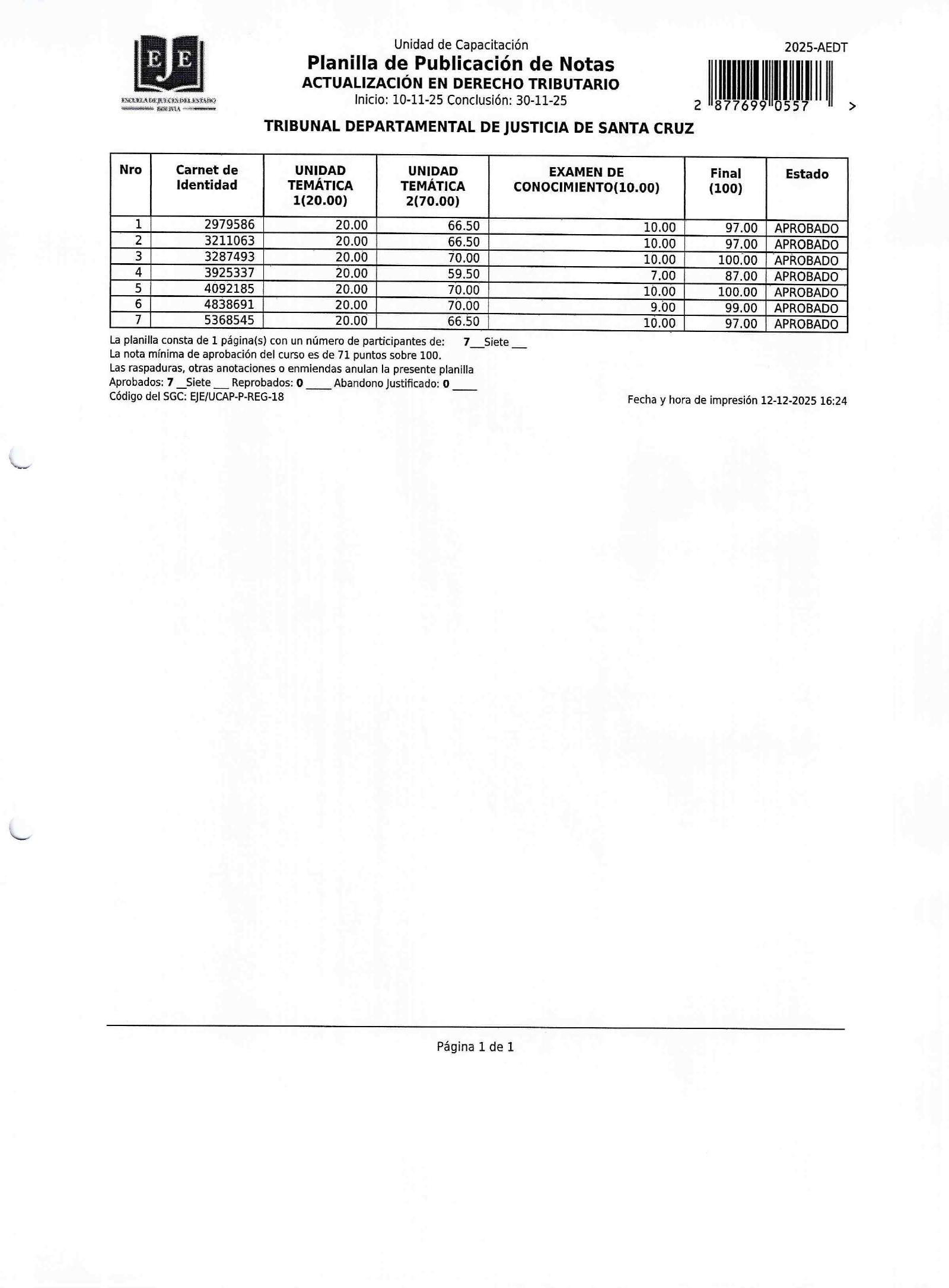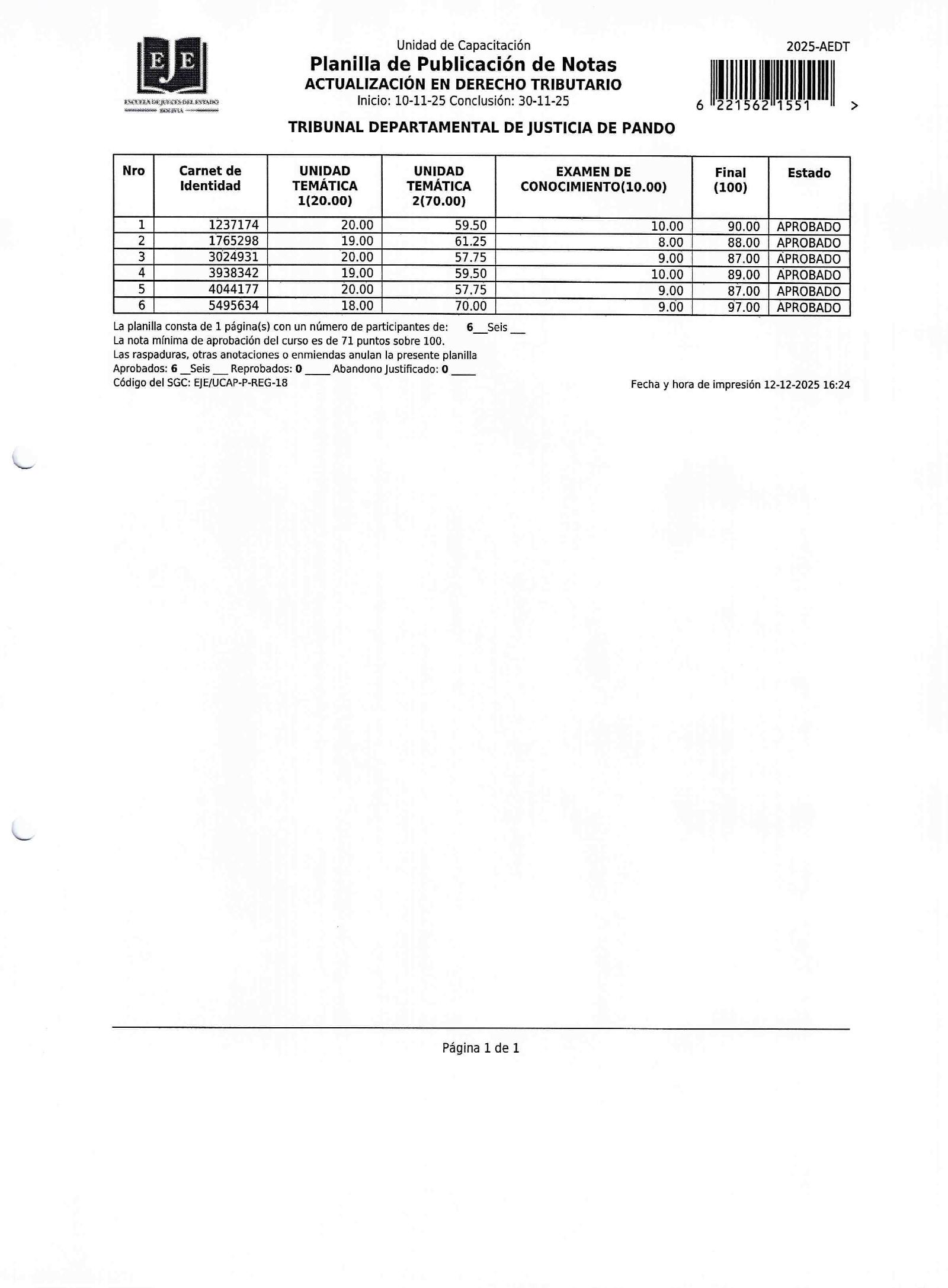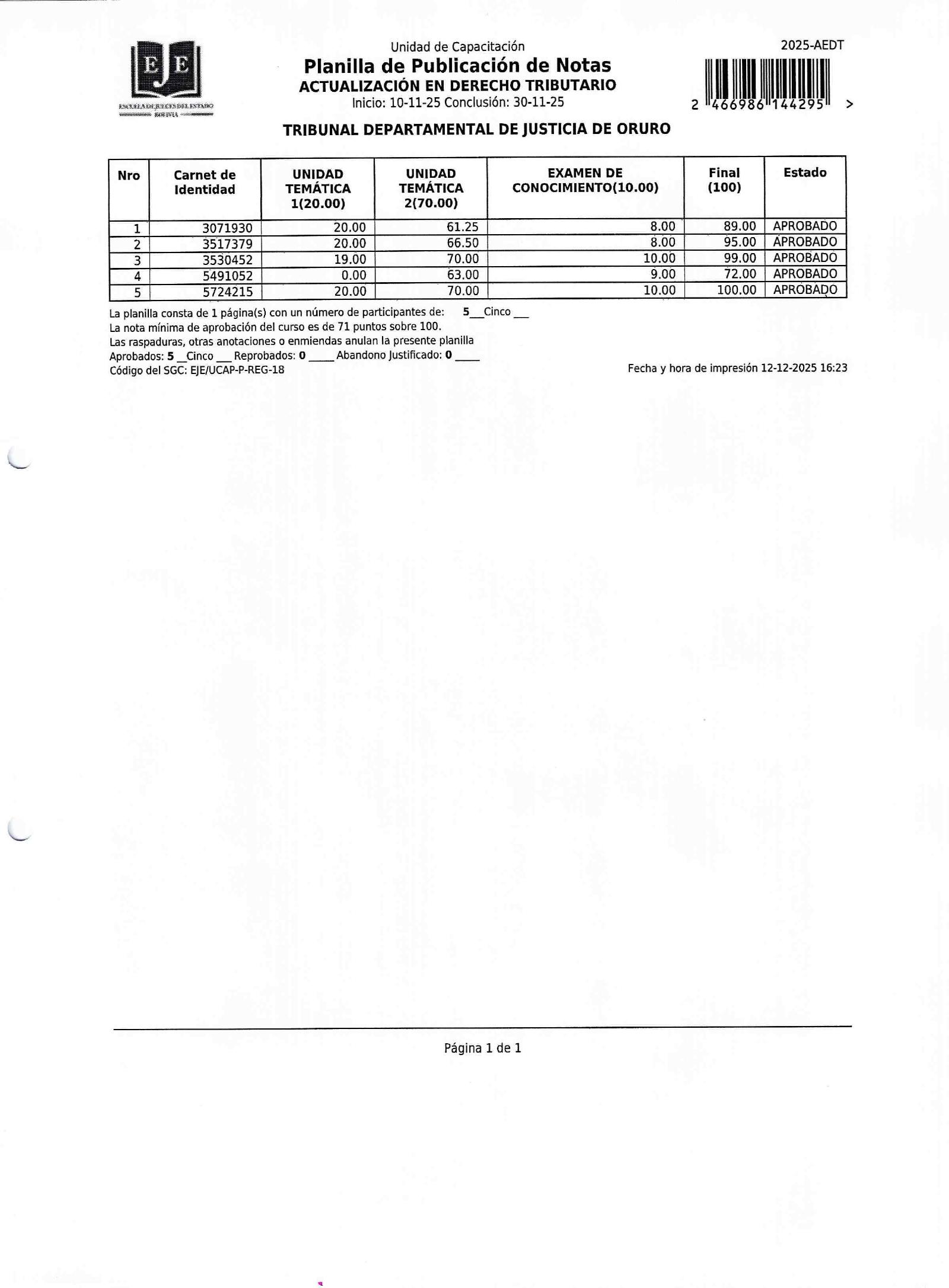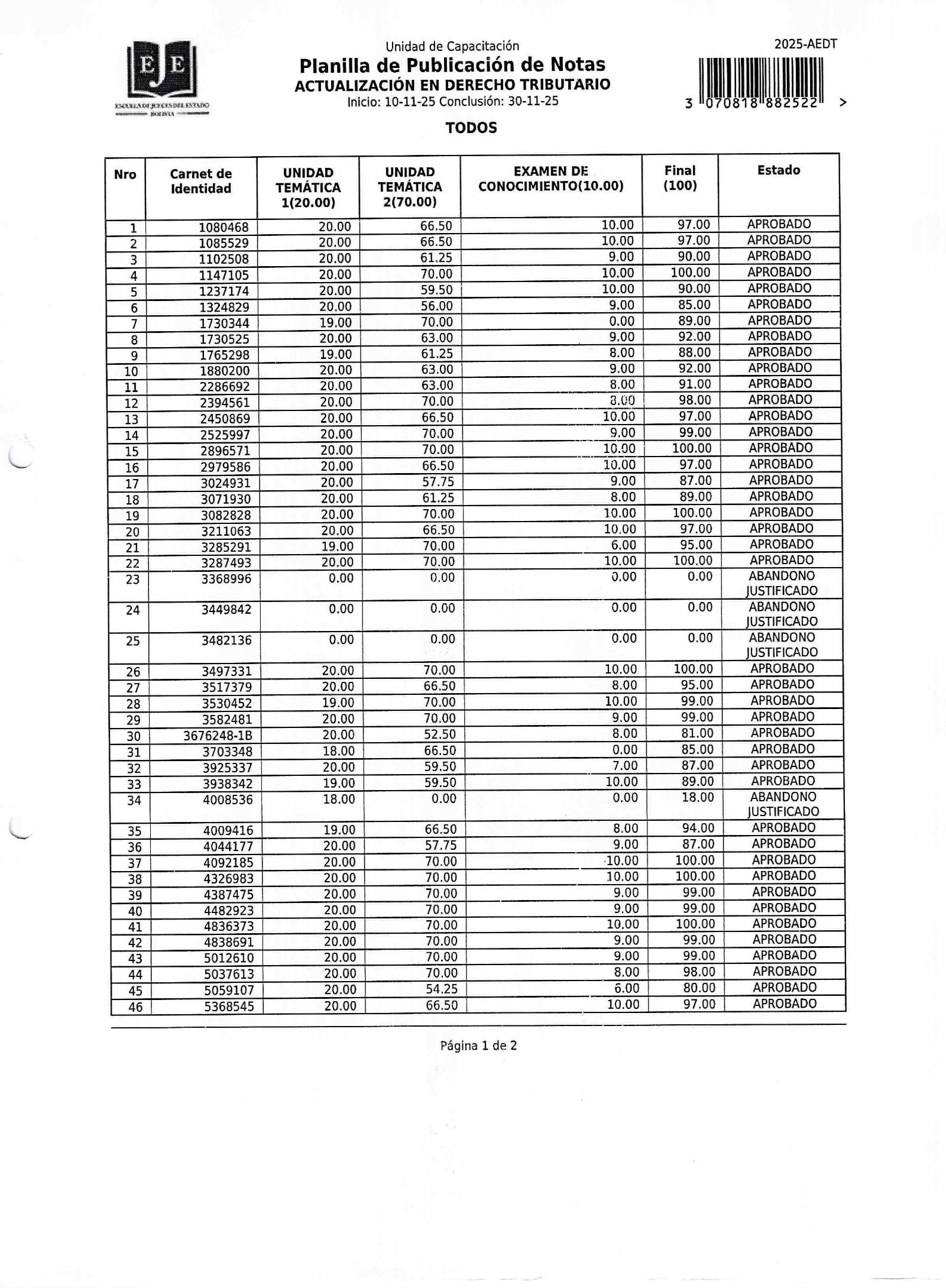 En estricto cumplimiento de las disposiciones académicas, establecidas en los artículos 41 y 42 del Reglamento Específico de la Unidad de Capacitación, se publica la planilla de calificación de la actividad denominada: