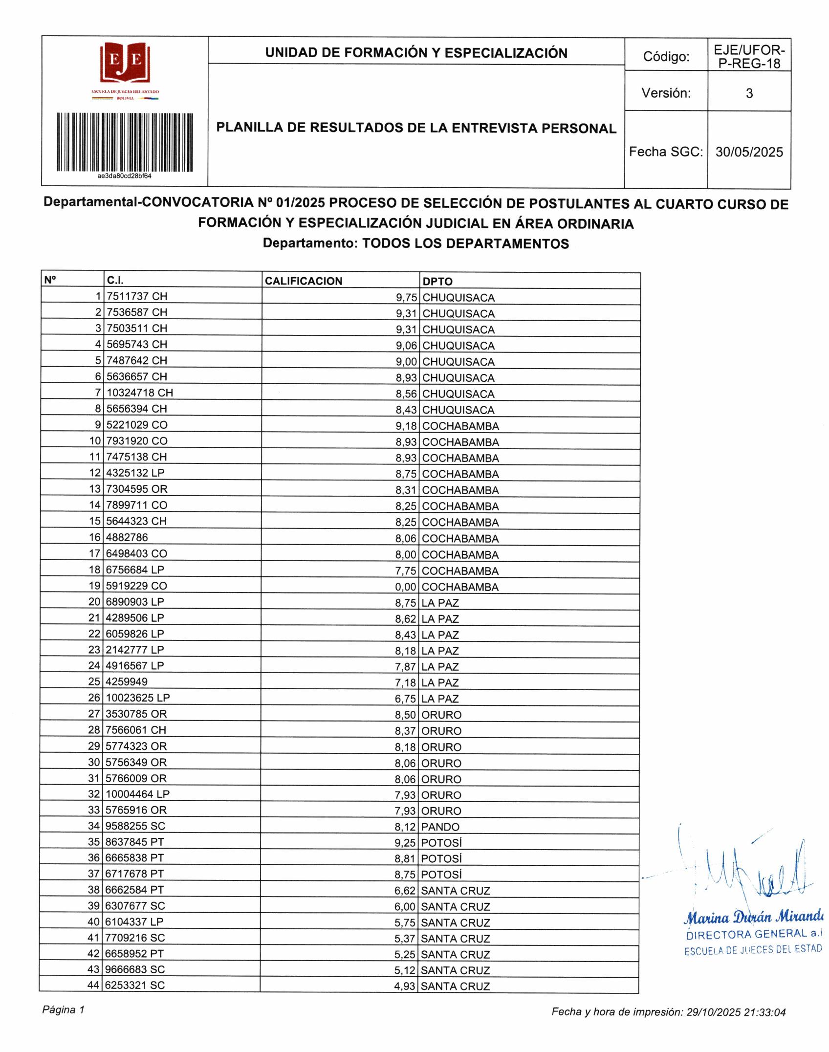 PLANILLA DE RESULTADO DE LA FASE DE ENTREVISTA PERSONAL – CUARTO CURSO DE FORMACION Y ESPECIALIZACION JUDICIAL EN AREA ORDINARIA CONVOCATORIA 01/2025