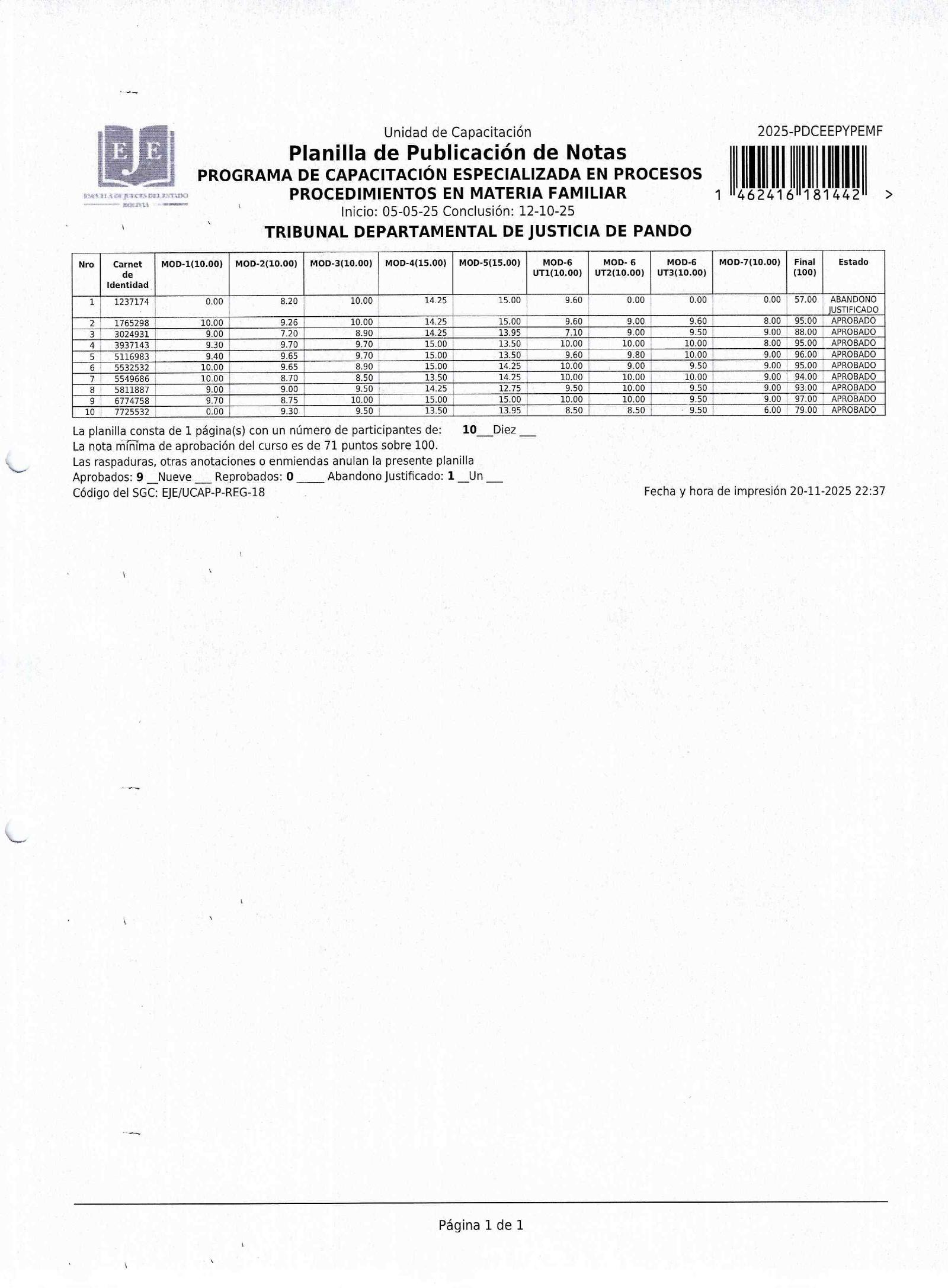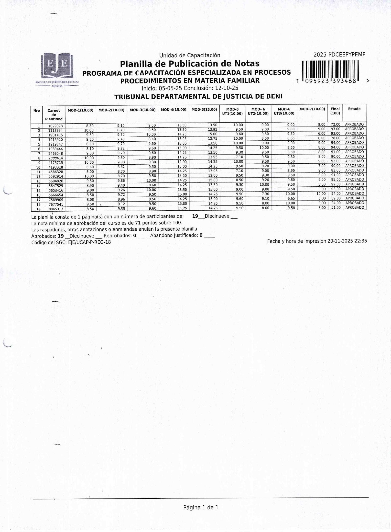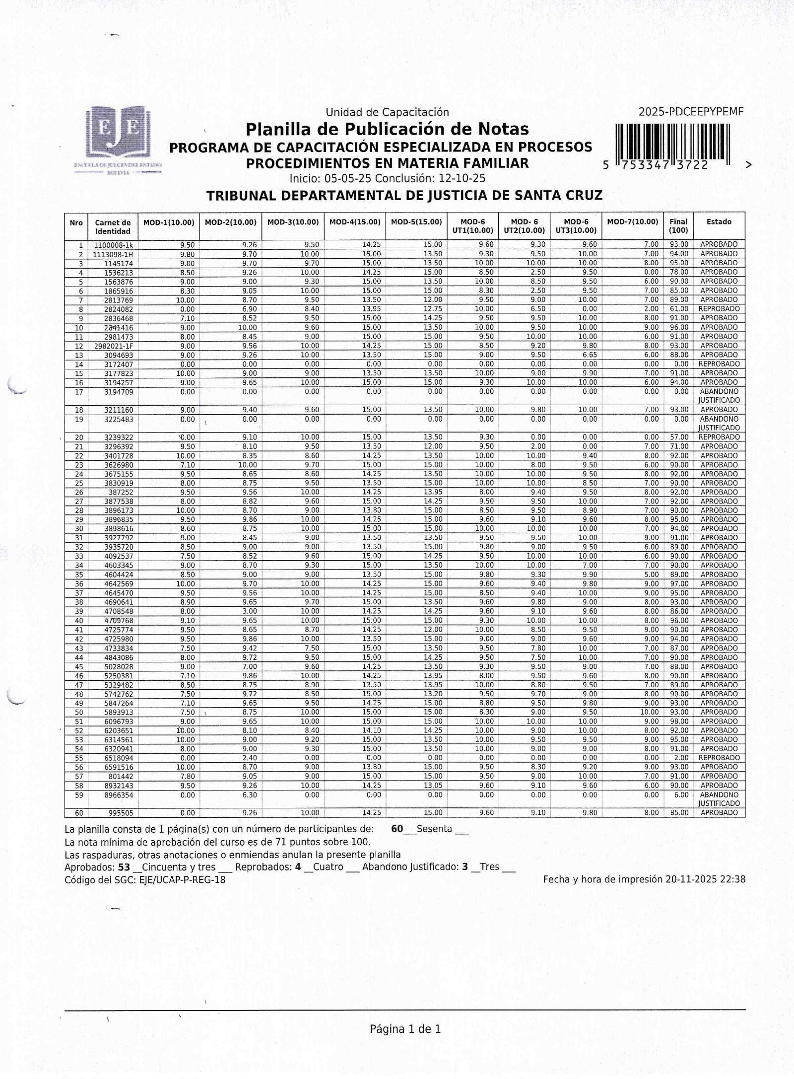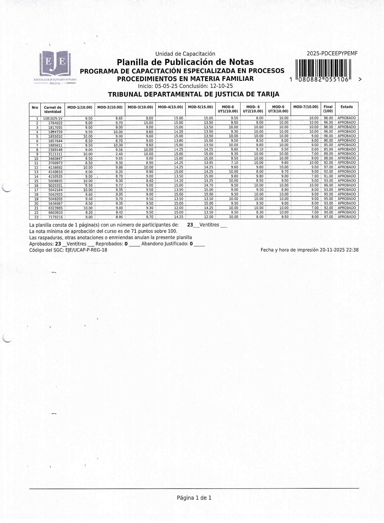 019/ PUBLICACIÓN DE CALIFICACIONES DEL “PROGRAMA DE CAPACITACIÓN ESPECIALIZADA EN PROCESOS Y PROCEDIMIENTOS EN MATERIA FAMILIAR”