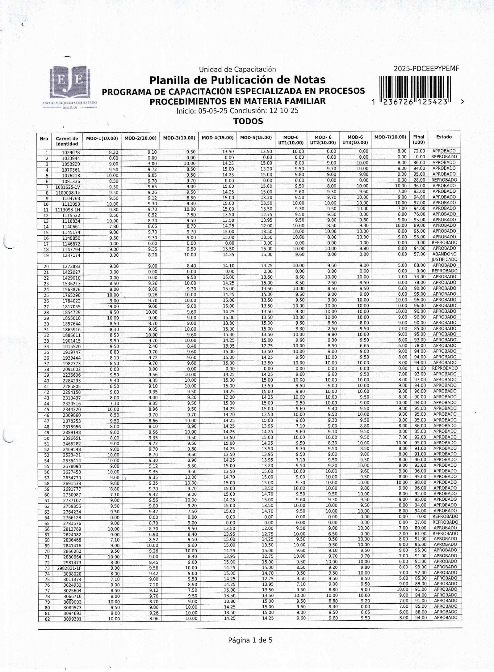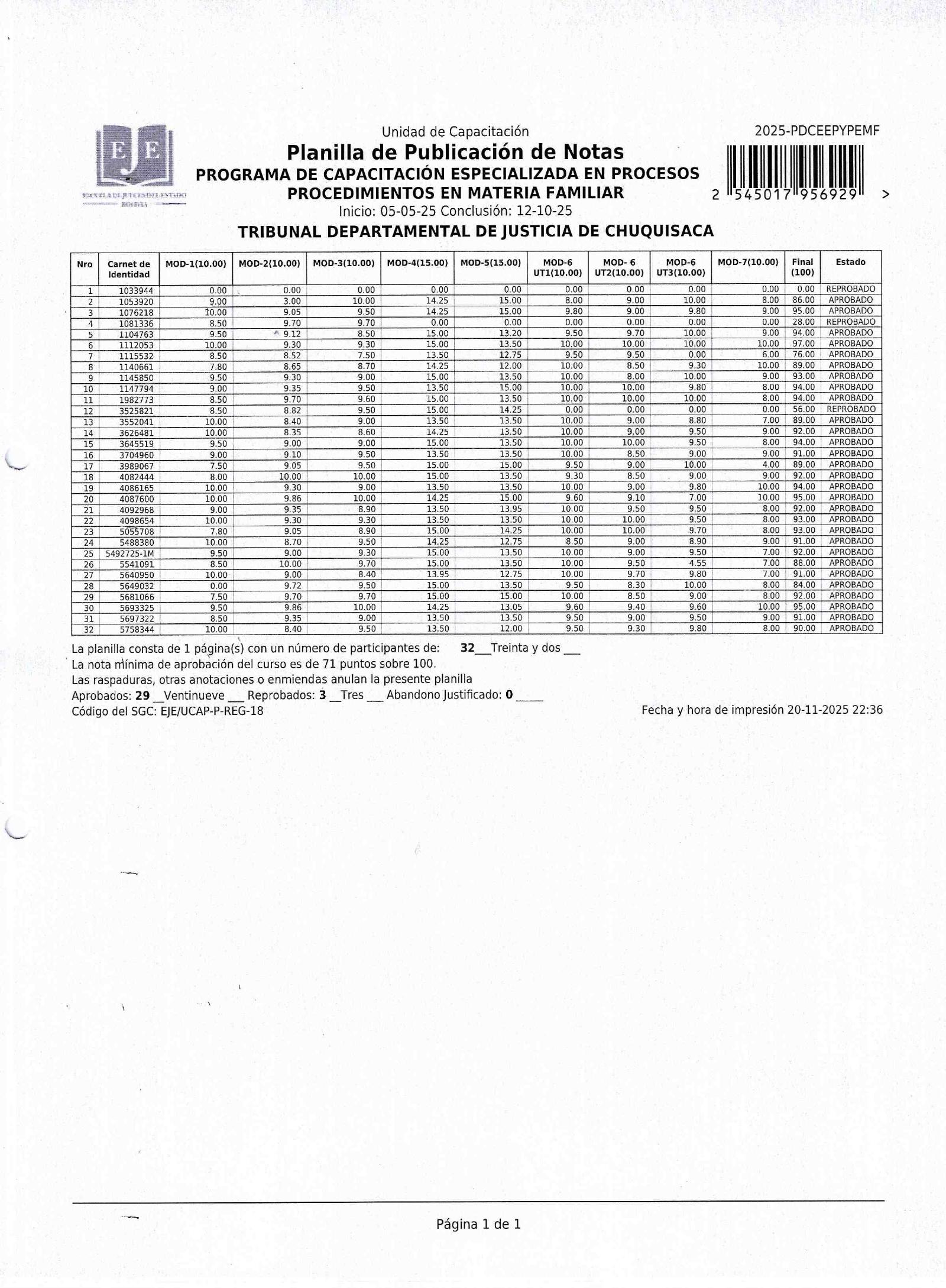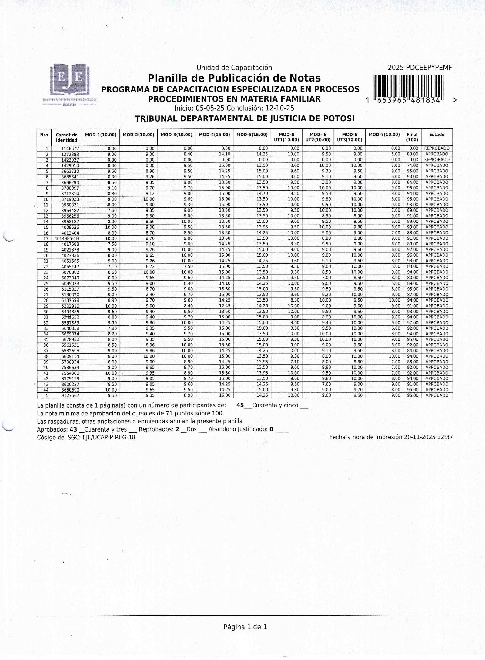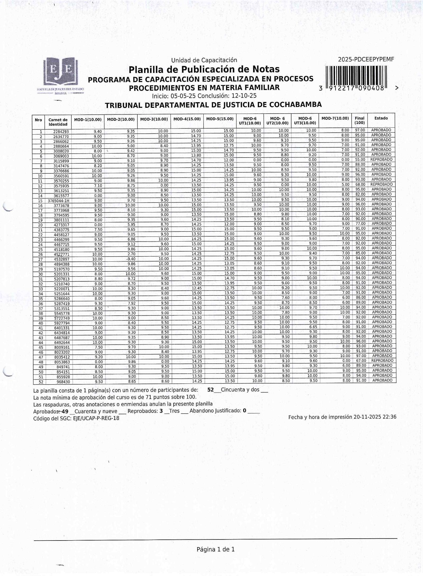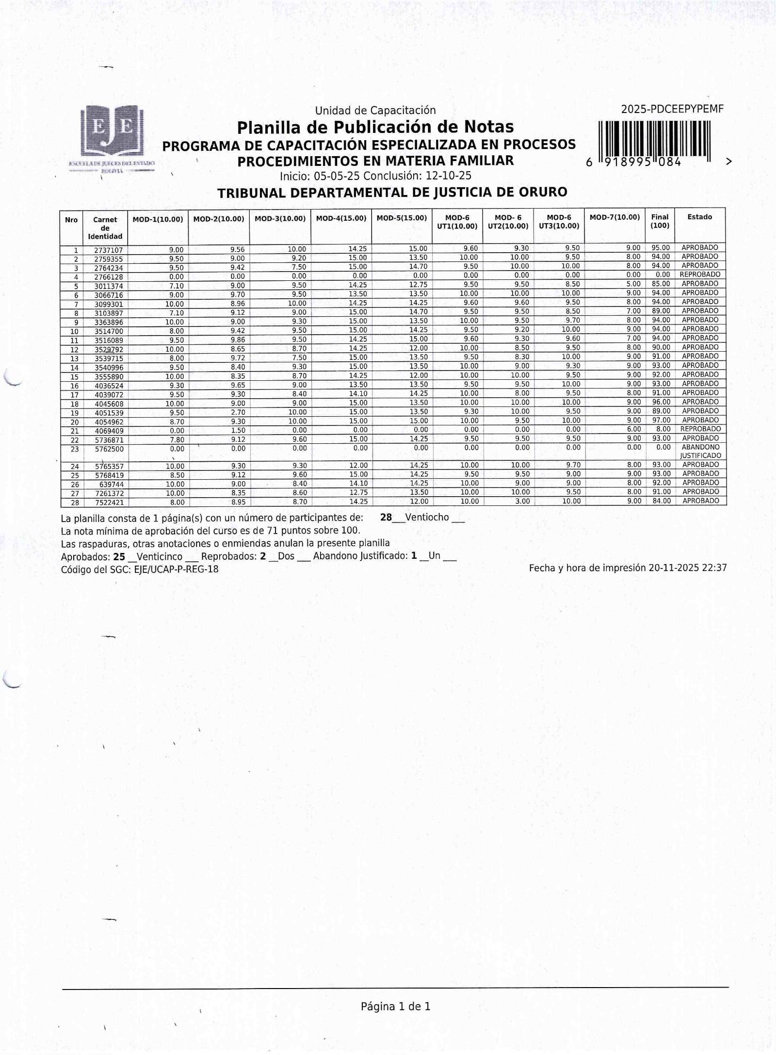 019/ PUBLICACIÓN DE CALIFICACIONES DEL “PROGRAMA DE CAPACITACIÓN ESPECIALIZADA EN PROCESOS Y PROCEDIMIENTOS EN MATERIA FAMILIAR”